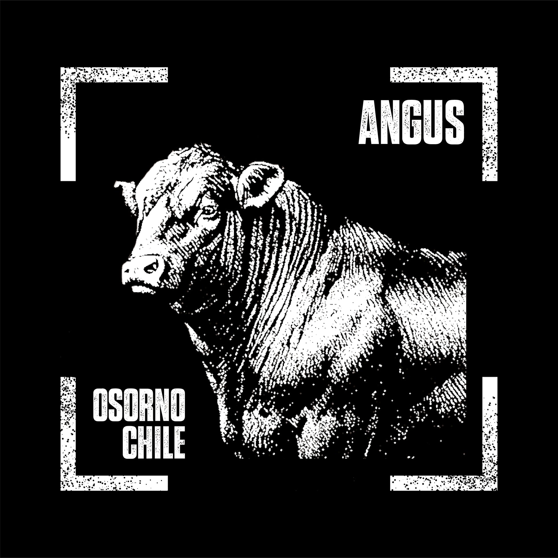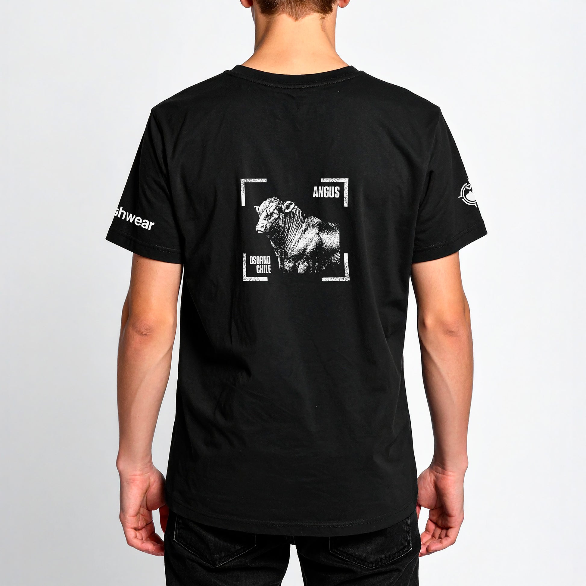 Polera negra de algodón con diseño estampado del Toro Angus, ícono de fuerza y tradición de Osorno.